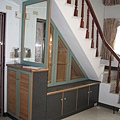 裝修前-原鞋櫃結合展示櫃的功能;裝修後-保有鞋櫃的功能,並賦予具收納的儲藏室和電視櫃