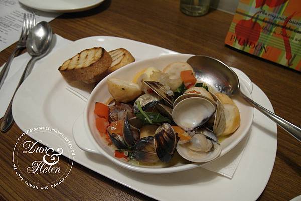 首先開味菜我們選了"白酒奶油煮蛤蠣、花枝丸與帶唇幹貝"$250